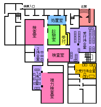 1階の外来施設の詳細はここをクリックしてください。 ※下図の色が付いた箇所をクリックすると写真と説明が出てきます |