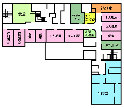 2階の病棟・手術室の詳細はここをクリックしてください。 ※下図の色が付いた箇所をクリックすると写真と説明が出てきます |